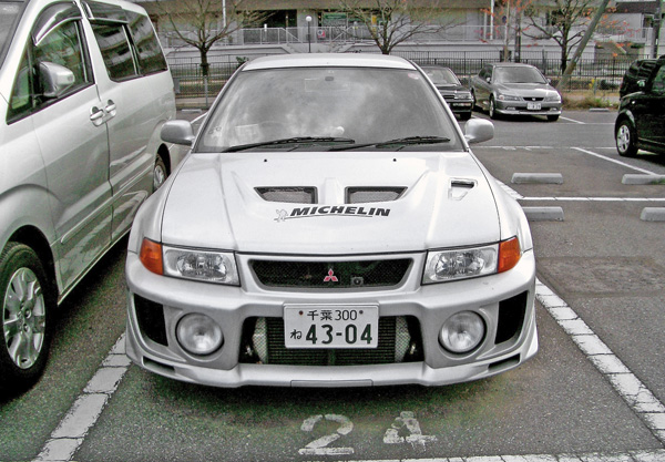 「エボリューション」は「ランサー」をWRCに参加させるための「ホモロゲーション取得用車両」として造られた車だ。ベースとなった車により4世代に分かれる。第1世代「エボⅠ~Ⅲ」(1992~95)、第2世代「エボⅣ~Ⅵ」(1996~99)、第3世代「エボⅦ~Ⅸ」(2001~05)、第4世代「エボⅩ」(2007~15)となる。写真の車は「V」のマークが見えるので1998年型で、レーシング仕様は「RS」だがこの車は街乗り用の「GSR」だ。エンジンは直列4気筒DOHC 16バルブ ターボ1997cc 280ps/6500rpmが搭載されている。