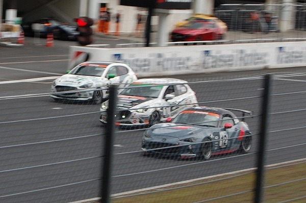 現在耐久レースで活躍中のマツダ車レースカー(MAZDA 2とロードスター)のデモラン。