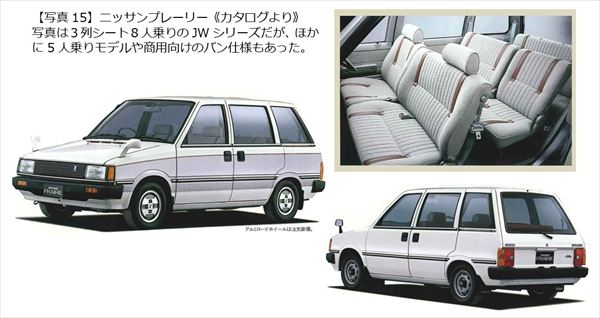 アメリカ、ヨーロッパ、日本で新しい形の乗用車としてすっかり市民権を得たミニバンは、キャブオーバータイプワンボックス車とセダン派生ステーションワゴンの中間的性格を持つが、多様なシートアレンジのできるものが多く、現在もっともオールマイティな実用乗用車である。このカテゴリーの牽引役となったのは1984年に登場したクライスラー社のボエジャー/キャラバンとルノーエスパスだが、そのコンセプトを最初に量産したのはニッサンプレーリーで1982年のことであった。プレーリーは全長4090mm、全高1600mmのボディながら3列シート/8人乗りを可能としていた。