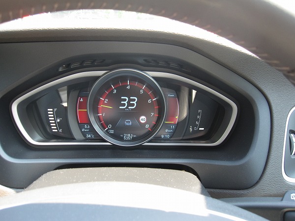 「スカンジナビアンデザイン」を標榜する内装デザイン(上がT4で、下がクロスカントリー)も、なじみやすく、好感のもてる造形に加えて素材の選択、カラーリングも魅力的だ。フロントシートのデザイン、座り心地、ホールド性などが大変好ましいものになっていることに加えて、リアシートも悪くない。ただしボルボ特有のセンターコンソールの後ろ側の小物入れはあまり使い勝手が良いとは思わない。カラー液晶ゆえに可能となったメーターパネル表示の3種類切り替えは興味深いが、個人的にはスピードがディジタルで大きく表示される「パーフォーマンスモード」が最も使いやすく、他のモードはほとんど使わなかったことをご報告しておきたい。カメラを駆使して制限速度や追い越し禁止標識などを表示するロードサインインフォーメーションはなかなか便利で、日頃自分がいかにこれらの制約に対してアバウトな感覚で走行しているかを思い知らされた(上記写真)。