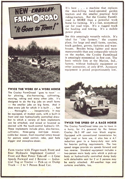 1951年に登場したクロスレイ「ファーム・オ・ロード(Farm-O-road)」。小型万能車で、現代のジョンディア ゲイター(John Deere Gator)などの元祖的存在。エンジンは26.5馬力だが、3速のトランスミッション+ギア比4:1のリダクションギアを装備して前進6速、後進2速として重量物のけん引も可能とし、前後にパワーテイクオフを備えていろいろな作業を可能としている一方、2~5人乗りのロードカーとしても使用できた。ホイールベースはセダンより432mm短い1600mmで、ベース価格は795ドルであった。