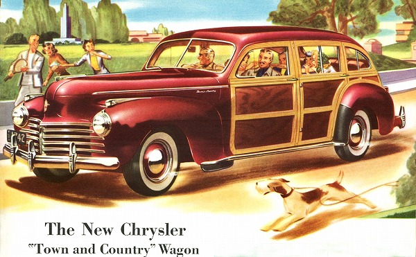 1941年3月に発表された1941年型クライスラー・タウン&カントリーワゴン。ホイールベース121.5in(3086mm)のC-28(ロイヤル)シリーズの車体に、ロングホイールベースのリムジン用のルーフパネルを組み合わせて造られている。左右ドア、クォーターパネル、リアドアはホワイトアッシュ(たも材)で組んだフレームにマホガニー合板を貼った本格的なものであった。エンジンは4ℓ直列6気筒108馬力で、1938年に登場した「Fluid Drive」と称する、エンジンとクラッチの間にフルードカップリングを標準装備していた。1395ドルの6人乗りと1475ドルの9人乗りがあり、それぞれ200台と796台生産され、1台はホイールベース127.5in(3239mm)、5.3ℓ直列8気筒137馬力のC-30(サラトガ)シリーズのシャシーに架装されていた。