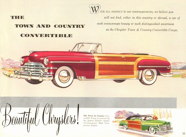 1949年型クライスラー・タウン&カントリー・コンバーティブル。ホイールベース131.5in(3340mm)、5.3ℓ直列8気筒135馬力エンジンを積むC46N(ニューヨーカー)シリーズのシャシーに架装された。このイラストではホワイトアッシュのフレームに囲まれた面にはマホガニー調のダイノック(Di-Noc)デカルが貼られているが、途中からボディーと同色の塗装に変更された。価格は3995ドルで、生産台数は993台であった。車両重量は2090kgで、オールスチールのニューヨーカー・コンバーティブルより160kgほど重かった。1950年型のラインアップから落とされるので、これがアメリカ車最後のウッディコンバーティブルとなった。