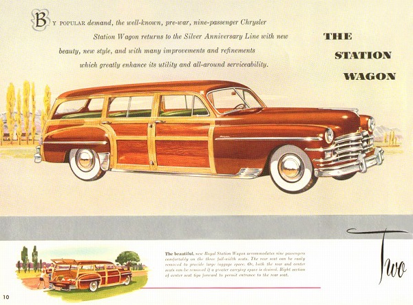 1949年型で復活したクライスラー・ステーションワゴン。ウッディモデルだがタウン&カントリーの名前は付かない。ホイールベース125.5in(3188mm)、4.1ℓ直列6気筒116馬力エンジンを積むC45S(ロイヤル)シリーズのシャシーに架装された。価格は2968ドルで生産台数は850台であった。