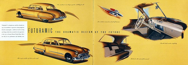 上の表紙のタイトルに「INTO A NEW GOLDEN ERA・・・FUTURAMIC Oldsmobile」とあり、1947年8月21日に創立50周年を迎えたオールズモビルであったが、若干遅らせて1948年をゴールデン・アニバーサリーとして新しい「フューチュラミック」スタイリングのプロモーションに活用した。