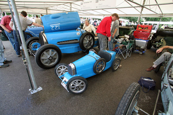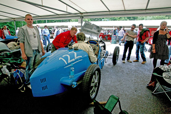 小雨の中で行われたイギリスのブガッティ・クラブ創立75周年のイベントだったが、周囲には興味深い色々の車が見える。ストリップ・ダウンしたT-35Bはどれを見てもタイヤの太さ以外は殆ど同じように見えてしまう。