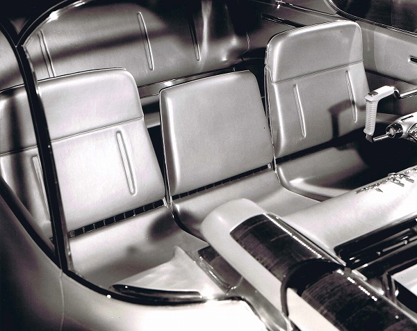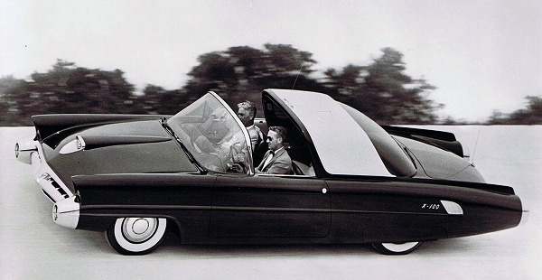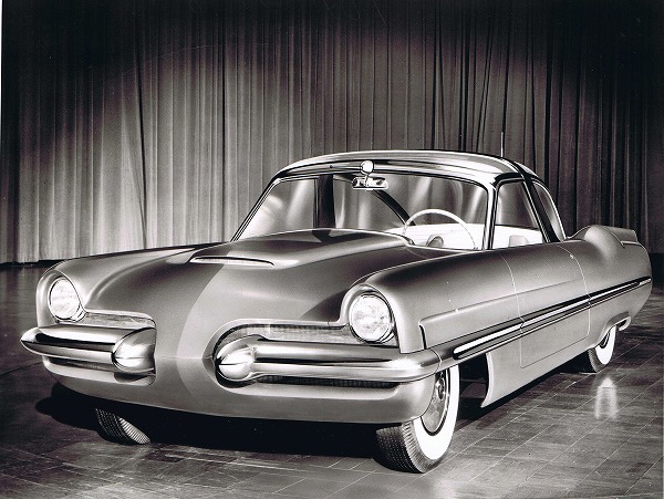 上の3点は1953年にリンカーン・マーキュリー部門から発表されたXL-500。赤(スカーレット)色のファイバーグラスボディーにプレキシグラスルーフを持つ、全長5493mm、全幅2070mm、全高1446mm、ホイールベース3124mmのスポーティーモデル。2分割型のフロントグリルとバンパー、アーチ型のリアフェンダー、そしてアーチ後方にはテールフィンが付く。内装は赤と白のレザーでまとめられ、ステアリングホイール中央のハブにはAT操作用のプッシュボタンが縦1列に並び、ホーンリングは消えて、ホーンスイッチはフロアに移されている。ワーニングランプ類はドライバー前面のウインドシールド上部に装着されている。ウインドシールドの上部中央から前方に突き出しているのは自動車電話用アンテナで、電話使用時には自動的に立ち上がる。また、ディクタフォン(dictaphone:口述を録音し再生するテープレコーダ)も装備していた。エンジンはリンカーンの205馬力V8を強化したものが搭載され、スピードメーターのフルスケールは150mph(241km/h)。電動のビルトインジャッキも装着している。(Photos:Ford Motor Company)