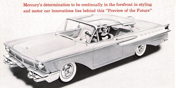 上の2点は「明日の世界から抜け出してきたようなドリームカーデザインの1957年型マーキュリー」のコピーとともに1957年シーズン途中から戦列に加わったターンパイククルーザー。XM-ターンパイククルーザーのデザインモチーフが取り入れられている。2次曲面のフロントウインドシールドの上面にはエアダクトが付き、リトラクタブルリアウインドーを持つ。ジェットポッドデザインは4灯式ヘッドランプ周りに採用されている。ターンパイクシリーズはマーキュリーの上級グレードで、他のシリーズが2576~3430ドルであったのに対し、3758~4103ドルと高価であった。