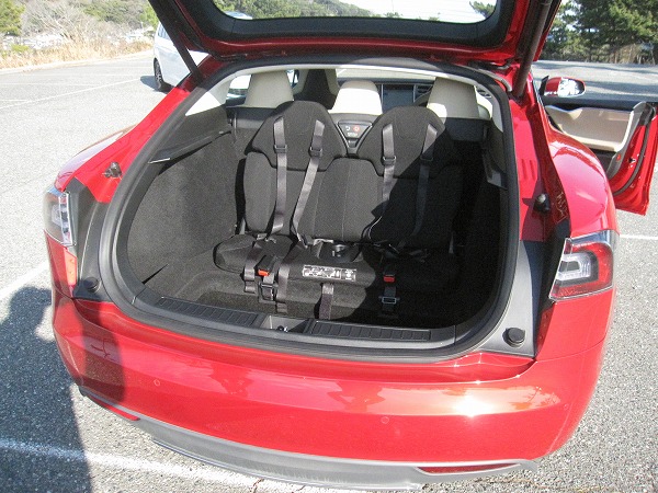 モデルSは7人乗りで(リアにガソリンタンクを置く必要がないため、後部座席の後ろに、後ろ向きの子供用シートが装着される)、シートをフラットにすると大きな荷室が得られる上に、エンジンの搭載もないので、フロントにもかなりなラッゲージスペースがある。写真のように完全にフラットなバッテリーパックとシャシーを一体化し、全てが乗員スペースの下に位置するため、クルマの重心が非常に低く、操縦安定性への貢献も大きいという。85kWhという大容量のバッテリーにより、一回の充電で最大528km走れるというのも魅力だ(ちなみに新型ニッサンリーフは30kWh)。今回試乗することが出来たP85Dは85Dの中でも性能の高い方のモデルで、高効率フロントモーターと、高性能リアモーターを組み合わせることにより、0-100km/hが3.3秒と、スーパーカーすら真っ青になる加速性能を発揮する。ただし価格はモデルSより500万円ほど高い1,369万円なので、販売台数は限られるだろう。