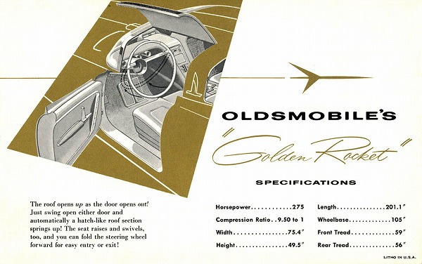 上の2点は1953年GMモトラマに登場したオールズモビル スターファイア "X-P ロケット"。シボレー コルベットをストレッチしたような性格のモデルで、ホイールベース122in(3099mm)のシャシーにファイバーグラス製ボディーを架装した6人乗りのクルマ。エンジンは98シリーズの303cid"ロケット V-8"の圧縮比を8.3:1⇒9.0:1に上げ、更に手を加えて35馬力アップの200馬力を発生する。デザインはオールズモビルのチーフデザイナー、アート・ロス(Art Ross)の主導で行われた。大きな楕円形のバンパーグリル、サイドモールディング形状などはその後の量産車に取り入れられた。しかし、下膨れの独特なドア形状、ヘッドランプに取り付けられた透明なカバーなどは採用されなかった。サイズは全長202in(5131mm)、全幅78.5in(1994mm)、全高54.3in(1379mm)(トップダウン状態)。ネーミングはGMアリソン製J-33ターボジェットエンジンを搭載したロッキードF-94A スターファイア戦闘機から頂戴している。製作台数は3台だが、2台はスクラップされ、1台は不明である。
