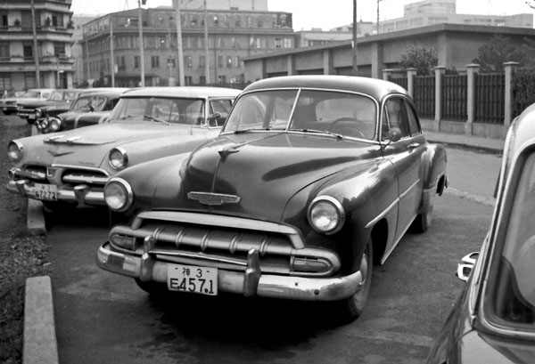 50年代初めのシボレーのラインアップは「スペシャル」と「デラックス」の2つだけで、それぞれにプレーン・バックの「フリートライン」と、ノッチバックの「スタイルライン」のサブ・シリーズがあった。この車はコンバーチブルだがノッチバックに含まれる。後ろに東京タワーが移っており場所は一の橋付近。