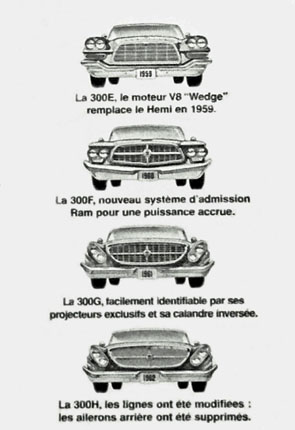 「300」シリーズは1961年の「G」シリーズからかグリルの上下をひっくり返し、他のクライスラーもこれに倣った。このスタイルは「300K」まで4年間続いた。(300シリーズ名の「I 」は使用せず)