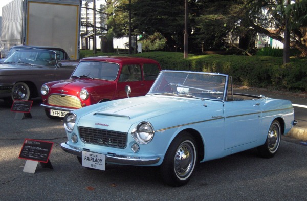 これもトヨタ博物館所蔵の1963年ダットサン フェアレディ SP310型と後方は1959年モーリス ミニ・マイナー。SP310型は、わが国初の本格的スポーツカーとして1962年10月に発売され、当初はセドリックに搭載されていたG型1488cc直列4気筒にSUタイプのキャブレター1基を付けた71馬力エンジン+4速MT(1速はノンシンクロ)を積んでいたが、1963年6月にはSUタイプのツインキャブ+圧縮比を8.0から9.0:1に上げて80馬力に強化し、同時にトランスミッションもクロースレシオの4速MT(1速はノンシンクロ)に換装されている。価格は初期のシングルキャブ仕様が85万円、ツインキャブ仕様は88万円であった。