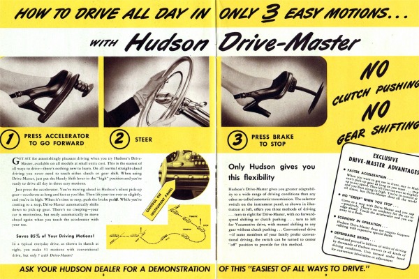 これは「ハドソン ドライブ・マスター」の説明。まだトルクコンバーターを使ったATが広く普及していなかった時代、ハドソンが1942年型からオプション採用を始めた、クラッチとMTの操作をバキュームによって作動させるセミATで「ハドソン ドライブ・マスター」と呼ばれた。ユニークなのはインストゥメントパネルのセレクタースイッチによって3通りの操作方法が選択できた。「HDM」を選び、シフトレバーをハイギア(3速)に入れてアクセルペダルを踏み込むと2速から発進し、シフトアップしたいときにアクセルを少し戻すと自動的に3速にアップした。ブレーキを踏んで車速が一定のところまで落ちると自動的に2速にシフトダウンされる。シフトレバーを1速、2速あるいはリバースに入れたときには変速はされない。「VAC」を選ぶと、シフトレバーの操作だけで、クラッチはバキュームによって自動的に作動する。セレクターを「OFF」にするとクラッチとシフトレバーによるマニュアル操作が可能であった。マニュアルが好きな人のためとあるが、システムが故障したときの保険であろう。