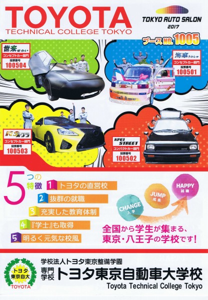 東京オートサロンはカスタムカー文化の確立を目指し、1983年に「東京エキサイティングカーショー」としてスタートし、1987年に名称を「東京オートサロン」と改め、今回は35回目の開催であった。今回の出典者数は458社、出展車両台数850台、ブース総数4320小間に達し、3日間の来場者数は32万4400人で、2015年から3年連続で30万人以上の動員を記録している。