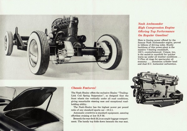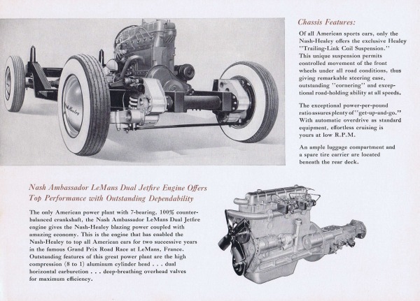 上の3点は1951年型ナッシュヒーレーのカタログ。シャシーはヒーレー製でフロントサスペンションはヒ―レー社が特許を持っていた「トレーリング・リンク・コイルスプリングサスペンション」、リアはコイルスプリングのリジッドであった。エンジンはナッシュアンバサダー用234.8cid(3848cc)OHV直列6気筒の圧縮比7.3:1を8.0:1に高め、SUツインキャブレターを装着した125馬力/4000rpmで、トランスミッションは3速MT+自動オーバードライブを積む。ボディーはアルミニューム製で英国バーミンガムのパネルクラフト社(Panelcraft Sheetmetal Co. Ltd.)で組み立てられた。サイズはホイールベース102in(2591mm)、全長170in(4318mm)、全幅60in(1524mm)、車両重量2400lb(1088kg)。最高速度は125mile/h(201km/h)に達した。価格は4063ドルで生産台数は104台。生産は1951年3月で終了し、ピニンファリナボディーへの切り替え準備に入っている。