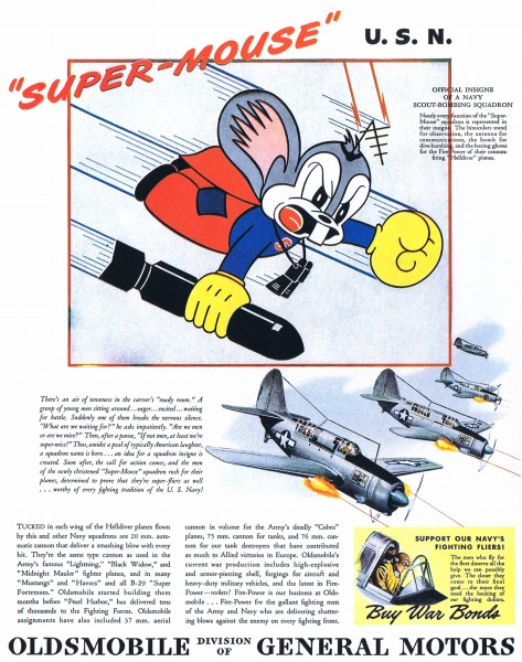 1943年にGMのオールズモビル部門から発行された、米国海軍のカーチスSB2Cヘルダイバーによる「スーパー・マウス」飛行編隊が20mm機関砲で攻撃している広告。オールズモビルの兵器生産に関する記録によると、真珠湾攻撃の数カ月前から生産・納入を開始していたが、1941年12月7日(日本時間12月8日)、日本軍による真珠湾攻撃を受けると、一気に臨戦体制に入っていく様が、克明に記録されている。オールズモビルは早速従業員のモラル、士気高揚のキャンペーンを張り、1942年1月18日からは、主力製品のひとつである20mm機関砲の生産ラインは、「スイング・シフト」と称する、週7日、3直24時間体制に入ったと記録されている。