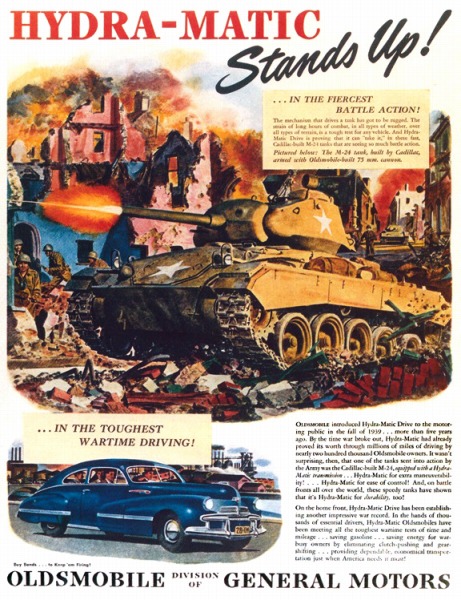 GMのオールズモビル部門が発行した広告。キャディラック部門が生産するM-24戦車に搭載する75mmカノン砲をオールズモビルが生産していたが、ここではGMが1939年に1940年型オールズモビルにオプション設定したハイドラマチック自動変速機が戦車に搭載されたことをアピールしている。ハイドラマチックはGMのセールスポイントであり、戦車に搭載されたことで、優秀さと耐久性が高く評価され、戦後に乗用車の拡販につなげたいという意図が感じられる広告。クルマは1942年型オールズモビル。