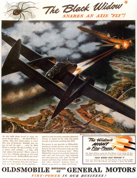 これもGMのオールズモビル部門が発行した広告。第2次世界大戦初期に欧州での航空戦をとおして、夜間戦闘機の必要性を痛感し、ノースロップに発注して完成した、アメリカ初の夜間戦闘機P-61ブラックウイドー。しかし、実戦配備されたのは1944年後半であり、ドイツも日本も既に戦闘能力はほとんど無く、宝の持ち腐れであったようだ。オールズモビルではこれに搭載する20mm機関砲を生産していた。