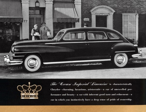 これはクライスラークラウンインペリアルリムジン。8人乗りのリムジンでホイールベース145.5in(3696mm)、エンジンはサラトガ、ニューヨーカーと同じ323.5cid(5301cc)直列8気筒135馬力を積み、車両重量は2211kgと重い。「フルードドライブ」を標準装備し、油圧作動トランスミッションとオーバードライブはオプションであった。価格は4305ドルで、1946~1948年の間に750台生産された。1947年型では運転席後方のパーティションの無い8人乗りクラウンインペリアルセダン(4205ドル)も発売され、1947~1948年の間に650台生産されている。