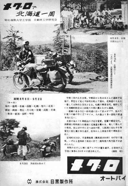 これは1952年の広告、手前にメグロの人気車Z3型500ccと、奥にジュニアJ型300ccが並ぶ。当時のツーリング風景をメグロではカタログや広告で展開していたが、実際のツーリングでは砂利道が少なく、ほとんどが山岳道のような土の路であり、雨が降れば愛車が泥まみれになるのは必至だった。