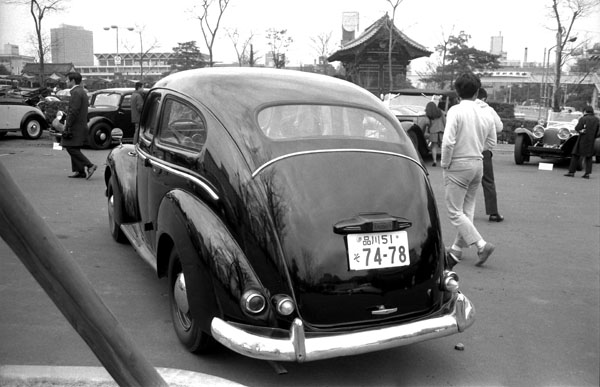 この車の案内板には1946年製と記入されているが、戦後製造が再開されたのは1948年からであり、横バーのグリルは1950年から採用された。51年からはドアに三角窓が付くので、それが無いこの車は1950年型と判定した。