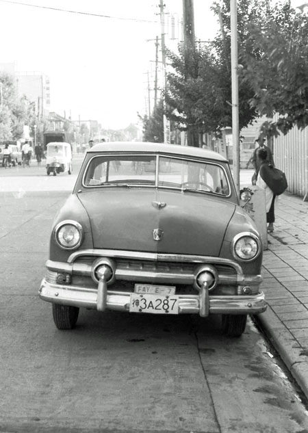 この写真の2台は別の車だが場所はいずれも僕の勤務先の前の「江川町通り」だ。最初の正面の車はすぐ隣の中島屋旅館の前に停まっていた車で仮ナンバーだが「岐/笠松」と入っている。ここは静岡市だが高速道路が出来る前は国道1号が東海道唯一の幹線だから、東西の移動では東京から約200キロの静岡は恰好な休憩ポイントで、県内の車だけでなく東京ナンバーの車もよく見られた。横向きの車は勤務先から50メートルほど先の「電話局」の横に停まっている。歩道には親・子・孫だろうか3人連が歩いているが、服装にご注目頂きたい。昭和30年代にはまだ婦人が和装で外出するのは当たり前のファッションだった。
