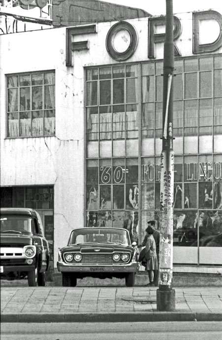 この車は去年から登場したインターミディエートの「フェアレーン500」で、フルサイズの「ギャラクシー」では「クラブ・ビクトリア」と洒落た名前で呼ばれるこのタイプも、このクラスでは普通に「テュードア・ハードトップ」だった。年毎にだんだん「個性のないただの四角い箱」に変わっていくアメリカ車には「外見ウオッチャー」の僕としては次第に興味を失って行ったから撮影枚数も減っていった。