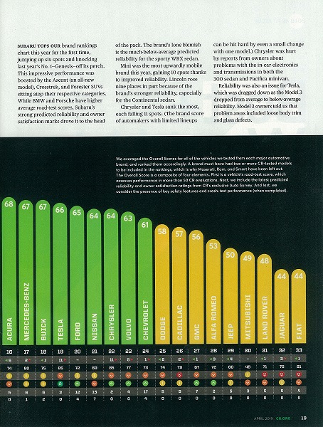 昨年1位だった韓国のGenesis(Hyundaiのプレミアムブランド)に代わり今回スバルが6ランクもアップして1位となったことについてCRは「今年のスバルの大躍進の原動力は新型アセントに加えて、クロストレック、フォレスターなどのSUVがそれぞれのカテゴリーでトップに輝いていることが大きな要因だ。Road-test scoreだけ見ればポルシェとBMWの方が高いが、スバルの信頼性に対するスコアーの高さがスバルを1位に引っ張り上げている。ただしWRXの信頼性データは平均値をかなり下回っている。」と述べている。
