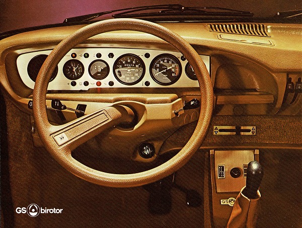 上の2点はGSビロトールのカタログから。フロントフェンダーとリアに「GS birotor」のオーナメントが付くので識別できる。1970年のパリ・ショーで、1015ccの空冷水平対抗4気筒55.5ps、FFの新型車シトロエンGSが発表されたが、1973年のパリ・ショーには、このモデルにコモトール製KKM624型995cc x 2ローター、107ps/6500rpm、14.0kg-m/3000rpmを積んだGSビロトールを発表した。翌1974年3月に発売されるが、同年6月、シトロエンはプジョーの傘下に入り、プジョーがロータリーエンジンに興味を示さなかったのと、タイミング悪く1973年に発生した石油ショックが、燃費の悪いロータリーエンジン車を敬遠させ、わずか847台造られただけで1年後の1975年3月に生産を終了してしまった。