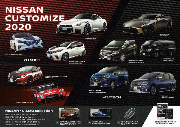 会場で配布された日産の展示車両を紹介したリーフレット。上段左下のSkyline 400R Sprint Conceptは東京国際カスタムカーコンテスト2020のセダン部門で最優秀賞を受賞した。