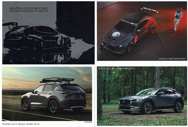 上の2点はマツダのブースと会場で配布されたカード。左上から時計回りに、ケース、MAZDA MOTORSPORTS(クルマはMAZDA 3)、CX-30 SIGNATURE STYLE、CX-5 TOUGH-SPORT STYLE(参考出品車)。
