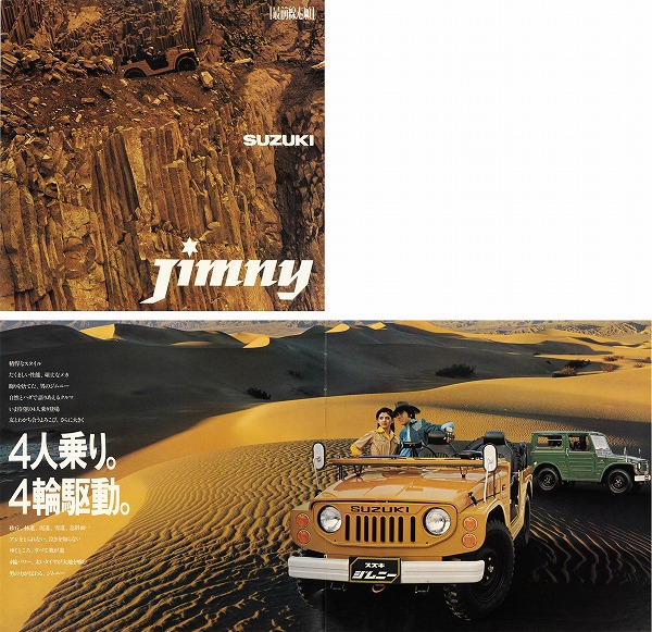 上の2点は、1980年にSUZUKI Deutschlandが発行した「SUZUKI eljot(LJ)(LJ80)」のドイツ語版カタログ。メタルドア付き幌型のみで、下段右側の個体にはオプションのハードトップが装着されている。フロントガードはいろいろなタイプのものがオプション設定されていた。マンガには、左側に「彼はそれ(ジムニー)を持っていなかった...」、右側には「彼はそれ(ジムニー)を持っている!」とあり、セダンで出かけたハンターはイノシシに遭遇したが、銃が座席の間に挟まって取り出せない!イノシシはよだれを垂らして逆に襲い掛かろうとしている。一方、ジムニーに乗ったハンターに遭遇したヘラジカは直感的に「ああ、もうだめだ ♰」。下段の2コマは、セダンのトランクには当然のことながら洗濯機は載らないが、ジムニーならピアノも積めるし、振動で泡はこぼれるがビアマグだって載せられるほど、乗り心地が良いということか? やや誇大広告気味だが。この手のマンガが4ページにわたって載っている。