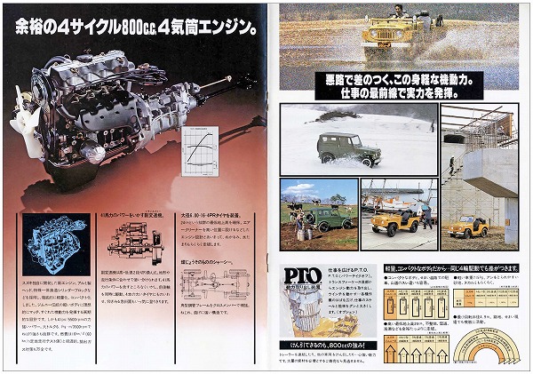 1971年1月にマイナーチェンジされた「LJ10-2型」のカタログ。エンジンは25ps/3.4kg-m⇒27ps/3.7kg-mに強化され、最高速度80km/h、登坂能力33°となった。同時にボンネットの両サイドに放熱用ルーバーが追加された。使い勝手の悪かったドア部の幌は、前ヒンジのパイプ枠キャンバス張りのドアに改良された。タイヤは6プライから4プライの6.00-16-4PRに換装され、乗り心地の改善が図られた。価格は工場渡し47.8万円で変わらないが、東京・大阪店頭渡しは2000円アップの48.4万円となった。