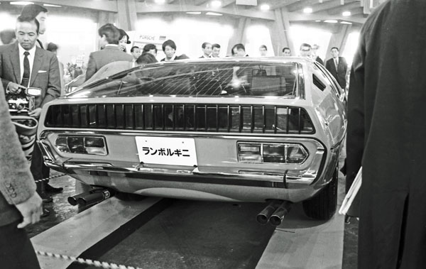 (ショー・モデル/マルッアル)速くて豪華な車を目指している「ランボルギーニ」は、レーシングカーまがいの「ミウラ」の売れ行きが好調だと言っても決してそれが本命では無かった。「400GT」の後を継いだ「イスレロ」は、ツーリング社からのボディの供給が止まってしまったための応急処置で誕生したものでニューモデルではない。「フェルッチオ」は「400GT」を上回るゆったり乗れる完全4シーターをVIP層向けに造ろうという構想を持っていた。それは未だフル4シーターを持っていないライバルの「フェラーリ」を出し抜くためでもあった。この話が具体的に動き出したのは、この車が67年のジュネーブ・ショーに展示された所から逆算すれば、1965年の「400GT 2+2」を発表した際「ミウラ」のボディ製作を依頼するため「カロセリア・ベルトーネ」と関係が出来た時だろう。当時のチーフ・デザイナー「マルチェロ・ガンディーニ」がデザインした。ミウラのシャシーをベースにしたためリア・エンジンだが、4人分のシートを確保するためにはV12気筒は大きすぎるので半分の6気筒にして後車軸より後ろに配置した。排気量は丁度半分の1964cc となった。ボディの構造上の特徴は上下ガラス張りの大きなガルウイングのドアで、キャビンのサイズから4ドアは不可能、かといって前開きの2ドアでは長過ぎて開閉に不便なところから採用された。「ガンディーニ」がこの車に与えたモチーフは「六角形」で、リアウインドウ代わりのルーバーは蜂の巣のようだし、運転席のメーター、パネルも「六角形」だった。(但しハンドルは丸かった)これらの奇抜な造形は「フェルッチオ」の考える保守的な顧客層の好みとは、いささか次元が異なると判断され、量産車とはならなかった。ただ全体のシルエットは魅力的で生産モデル「エスパーダ」にも影響を与えている。