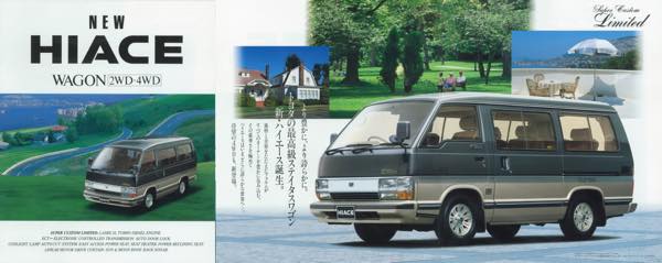 「4WD新登場」とあるが、このカタログは1987年8月発行のもので、ハイエースはこの時のマイナーチェンジでようやく4WDが加えられた。まだ5MT車のみの設計で過渡期の技術といえた。2年後には新型100系のデビューを控えており、乗用ワンボックス車の世界では日産の先行を許していた。