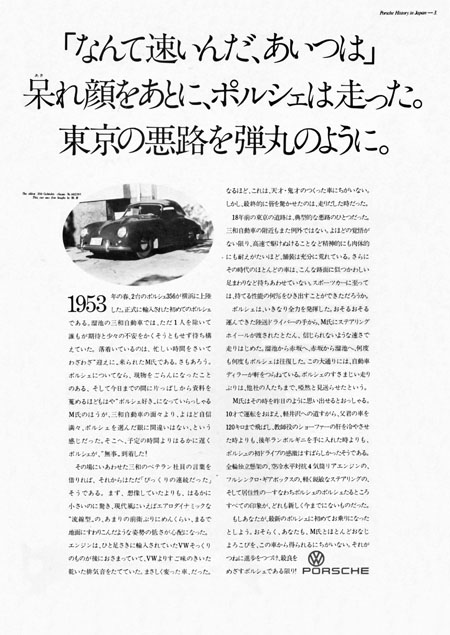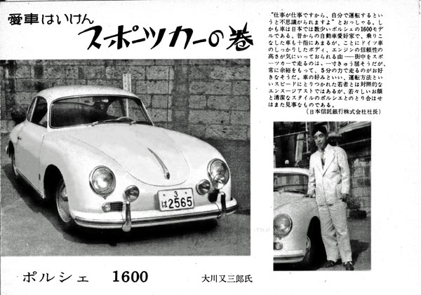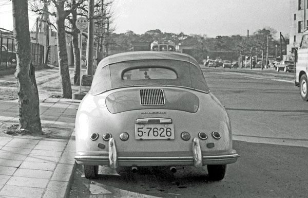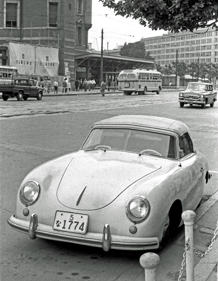 「ポルシェ」が日本人向けに初めて輸入されたのは1953年「三和自動車」によるものだった。カーグラフィック1971年8月号の裏表紙に輸入元の「三和自動車」の広告(参照)があり、それによると「53年春」となっているが、NEKO出版の「心に残る名車シリーズ・13/ポルシェ1980」(P-87) では、当時のメカニック吉岡晶氏は最初の2台は「7月」、続いて「10月」にも2台が上陸したはずと語っている。写真の車はその最初の2台の内赤のカブリオレだ。(もう1台は緑のクーペ)広告に掲載されていた写真の車のナンバーが「5-7626」で、この車と一致したのだ。1953年輸入時(ルビー・レッド)→1960年撮影時(白・前後の茶色は塗装下塗りと思われる)→1979年・京ナンバー(ルビー・レッド)でオリジナルカラーに戻っている。
