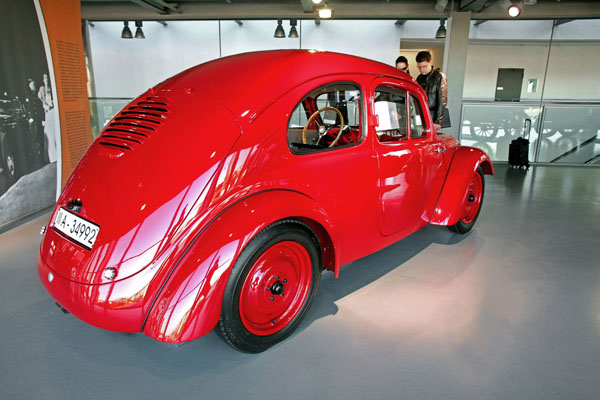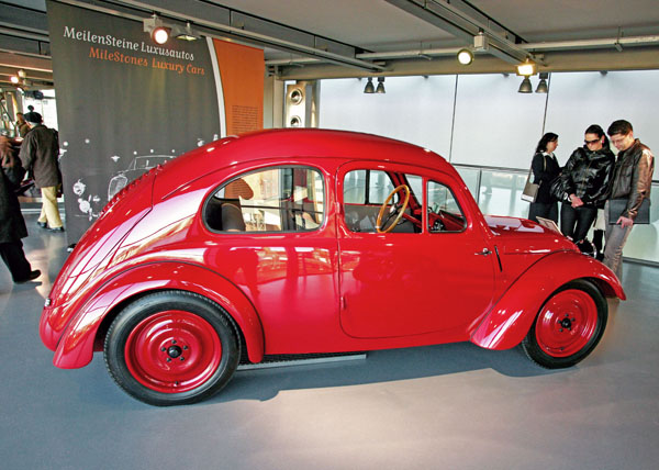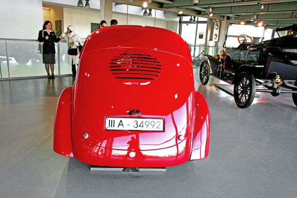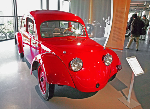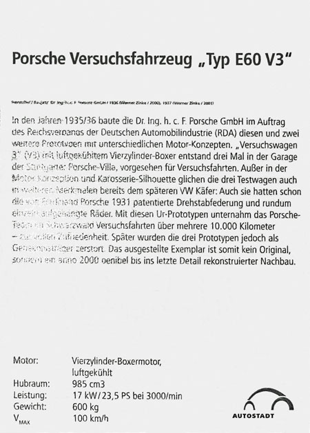 1934年ヒットラーのお声がかりで「VW」計画が本格化した。案内板には「ポルシェ試作車“Typ E60 V3”」とあったが、この車の企画の発注者は「RDA」(ドイツ帝国自動車産業連盟)というドイツ中の自動車メーカーが政府の命令で結成させられた団体によるもので、「VW」という「車名」も「会社」もまだ生まれていない。だからこの車が完成した時の正式名称は「1936 RDA V3 Porsche Type60」だった筈だ。1934年契約を結び、1935年プロトタイプが2台「V1」「V2」、翌1936年3台の「V3」が完成した。写真の車は試作3号車に当たりポルシェ設計番号は「Type60」が付けられた。