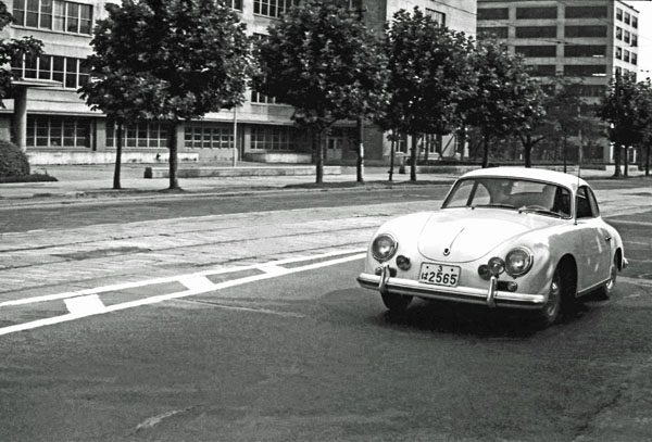 この写真は車を探して官庁街をうろついていた時、突然走って来た大珍車「ポルシェ」をとっさに捉えた傑作だ。当時街を歩くときは常に首からカメラを提げ、何時でもシャッタ―が切れる体制でいたことは確かだが、今考えると可成り変な人に見えていたかもしれない。この時は細かいことは判らなく、「3ナンバー」だから多分「1600」と見当を付けていた。(当時「5ナンバー」は1500cc迄だったから)しかし後年雑誌で見つけた記事で同じナンバーと気付きポルシェ・クラブ会長の車だったことが判り、1957年の「356A 1600 スーパー」と確認できた。