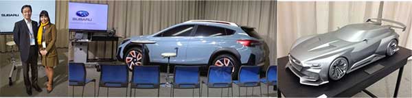 写真解説)2016年栃木県葛生町のSUBARU研究実験センター(通称テストコース)で実施されたファンイベントにてデザインプレゼンテーションブースを開設し、竹岡圭さんとトークショーをやらせて頂いた。2015年の東京モーターショー展示のコンセプトカーやプレステにSUBARUが提供した“超合金鰹節・VIZIV-GT” 1/4モデルを展示した。