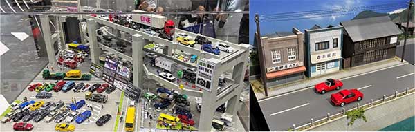 その他、会場にはさまざまな展示がありました。大きなジオラマでは、ミニカーが生き生きと走っている様子が再現されていました。また、来場者が持参したお気に入りのトミカを置いて写真撮影ができるジオラマもあり、こちらは昭和の街並みを模したセットで、1960年代の旧車ミニカーがよく似合う演出になっていました。