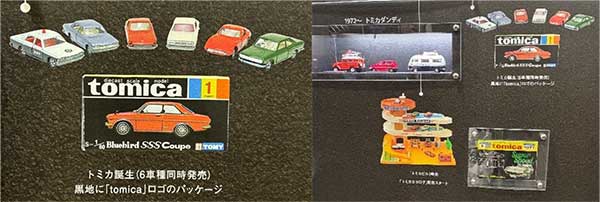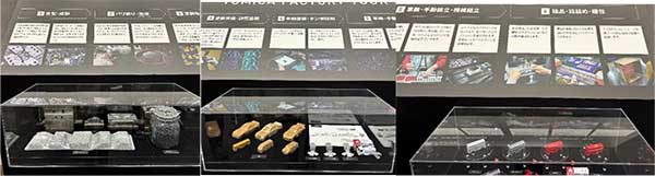 写真解説)トミカが出来るまでの展示。原型の木型もあり充実している。バックでは作業工程の動画も流れている。
