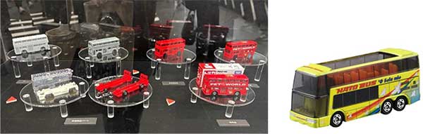 写真解説)トミカの中で一番息が長く売られているのは、このN0.95の2階建てロンドンバス。1977年から発売されており今なお現役!2025年現在で、48年もの長きにわたり楽しまれている。隣の写真は日本が誇る観光バス“はとバス”ルーフがオープンになっている。