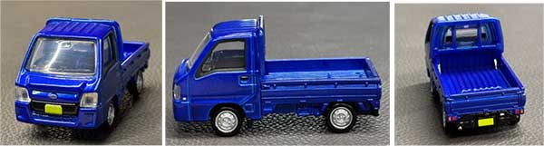 写真解説)トミカプレミアム:SUBARUサンバー。リヤエンジンの点検口が荷台床にあるのも見事に再現されている。実車はSUBARU製サンバーの生産中止を記念してWRブルーの外装色をまとった特別仕様車が企画、発売された。当初500台限定であったが発売日を待たずに完売してしまったので、追加で500台、予約のお客様に許可を取って増産させた。