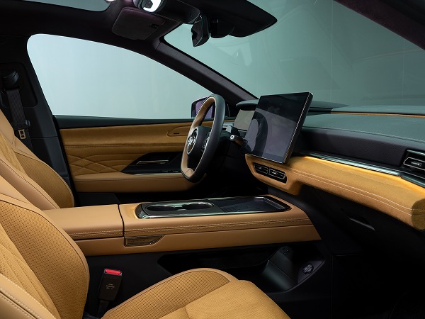 EZ-6の大きな特徴、これはまさに中国のもつイメージへの対策ともいえるが、マツダデザインの重要なシグネチャーウイング(フロントグリル周り)が光るように仕立てられたことも挙げられる。岩内さんによると、「これまで“魂動デザイン”の家紋として、シグネチャーウィングをクロームで表現してきました。そこから新たにBEV時代を表現すべく、モダンさを訴求するために羽ばたく翼を光で表現しています」という。この光はアニメーション機能も備えており、オープニングの時に光が動いたり、給電の時に点滅してインジケーターになったりしている。岩内さんはこれを「BEVとしての先進性を示すようなアイテムとしても使われています」と説明している。