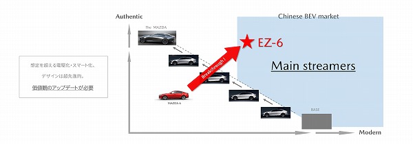 EZ-6の開発は2022年の春ごろにスタートした。中国市場におけるマツダのEVとしてのプレゼンス(存在感)をどう打ち出すかが課題だった。岩内さんは、当時の中国市場の分析と、EZ-6のデザインの方針を以下のように語る。