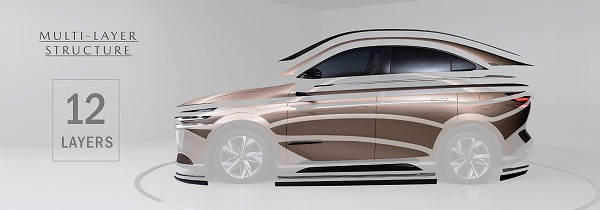 そこでボディを薄く、低く見せるために2つのテクニックを用いた。まず、「あらゆるモチーフを水平方向に見せるために細かく切り刻んで(あとから数えたら12層あったという)、なるべく視線が前後方向に抜けるように見せるようにしました。これにより前後方向に長い塊として見えてくるのです」。人間でも横ストライプを着ると横に広い体躯に見え、縦ストライプを着るとスリムに見えるのと同じ効果を狙ったわけだ。