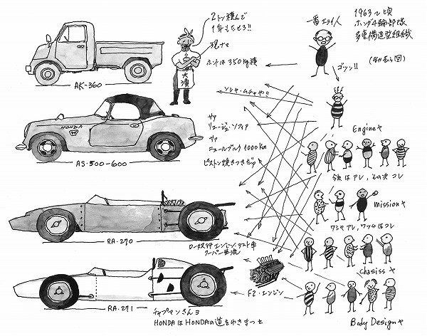 このイラストは、ホンダにおける自動車開発の初期の状況を表しています。三輪自動車を中心に製作していた自動車メーカーであった「くろがね」からホンダに移籍した中村先生が四輪車開発のトップとなり、同時にホンダに入社した何人かの同僚によってホンダの「四輪部隊」が形成されたとおっしゃっていました。イラストにあるように当時は二輪車メーカーであったホンダが四輪市場に進出するためにトラックのT360をはじめ、ホンダスポーツの設計・開発のさなかに、未知のマシンというべきF1の設計・開発にとどまらず、エンジンを含めて車体までもつくることになり、多忙を極めていたと話され、特にホンダスポーツはボディのデザインが次々と変わるので、中村先生としては“どんなボディでも載せることができる”フレーム構造を採用したとおっしゃっていました。フレーム構造のために結果として車重は想定よりも重くなってしまったのですが、モノコックのボディ自体でも強度があり、さらにフレームに載せたためにホンダスポーツは、当時としては強固なボディ剛性が確保され、様々なグランプリレースでも活躍できた要因のひとつになったと教えてくださいました。